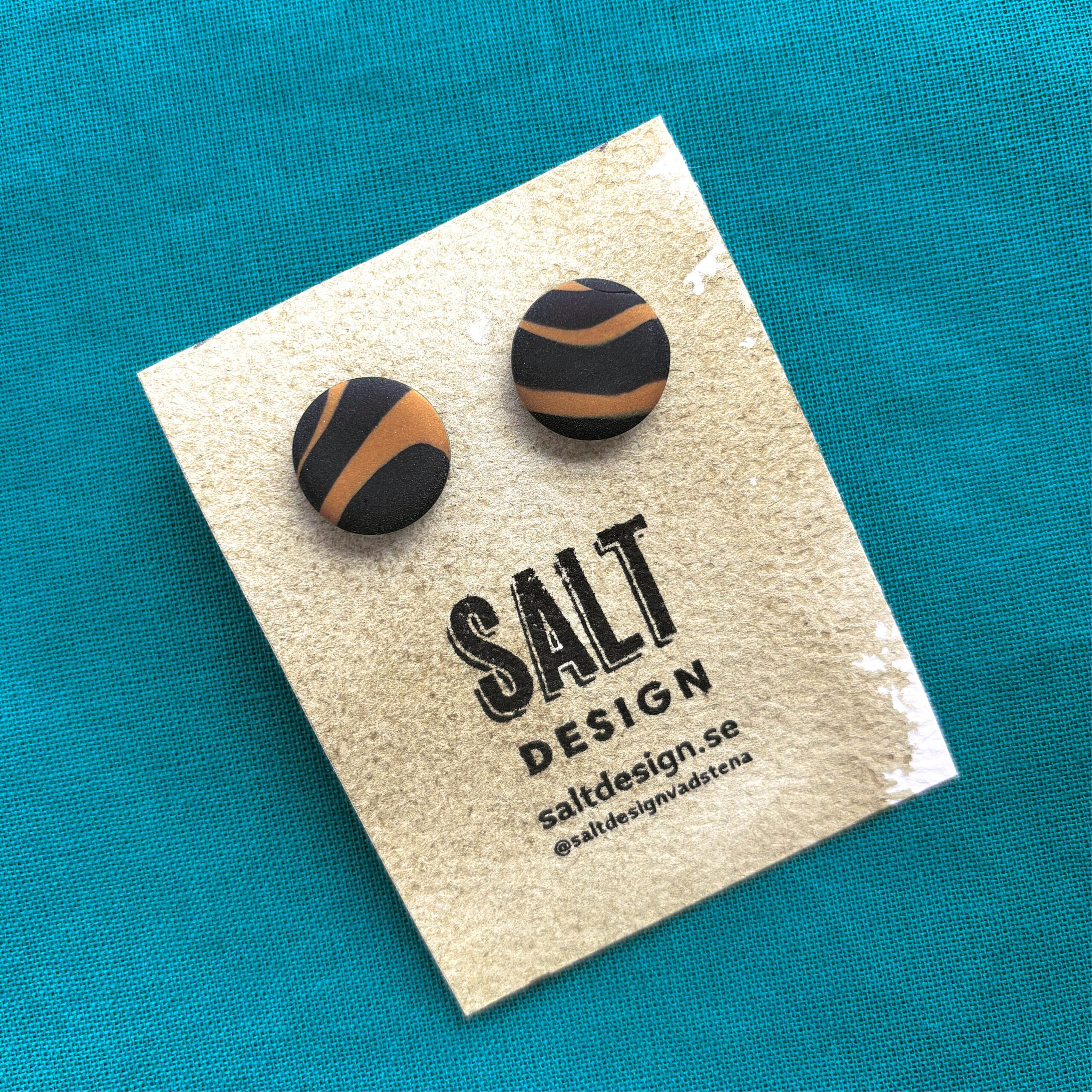 Handgjorda med unik design. Väger nästan ingenting så lätta att bära. Material: Polymerlera och rostfritt stål i bakstycket. Diameter 15 mm.